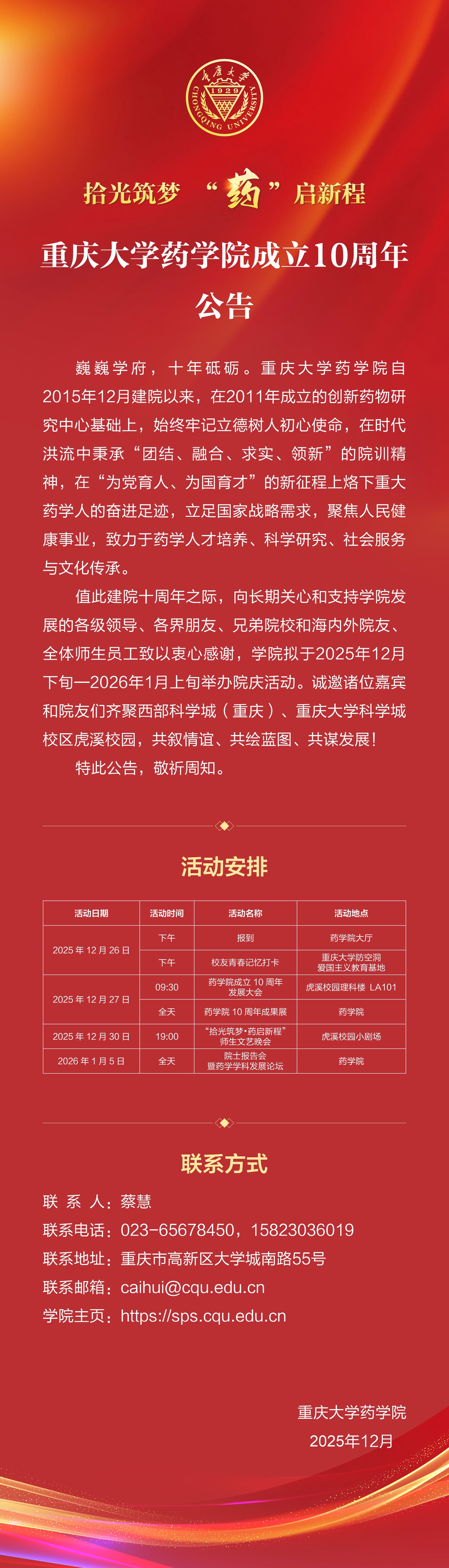 拾光筑梦 “药”启新程 重庆大学药学院成立10周年公告