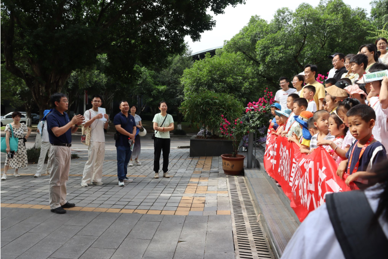 随后,药学院代元伟副教授和张功副教授分别作为带队指导老师,引导教职工和孩子们徒步虎溪校园植物园,沿途讲解各类药用植物如海金沙、麦冬、铁树的特性与功效。孩子们认真观察中草药植物的叶片形态、嗅闻独特香气,近距离感受药用植物的神奇魅力,现场氛围热烈。